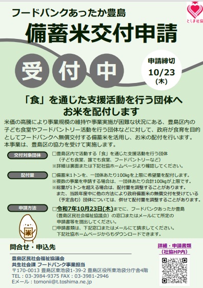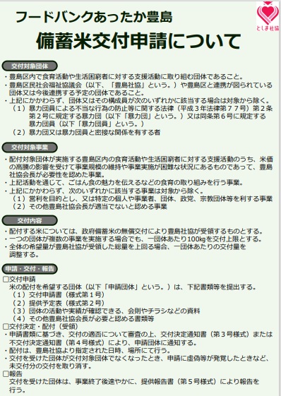 米価の高騰により事業規模の維持や事業実施が困難な状況にある、豊島区内の子ども食堂やフードパントリー活動を行う団体などに対して、政府が食育を目的としてフードバンクへ無償交付する備蓄米を活用し、お米の配付を行います。
