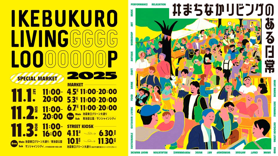 「まちなかリビングのある日常」をコンセプトに例年開催しているIKEBUKURO LIVING LOOP(池袋リビングループ)を今年も開催いたします。池袋駅東口のグリーン大通りを中心に、居心地の良い歩きたくなるまちの実現を目指して、様々な活動を行っております。