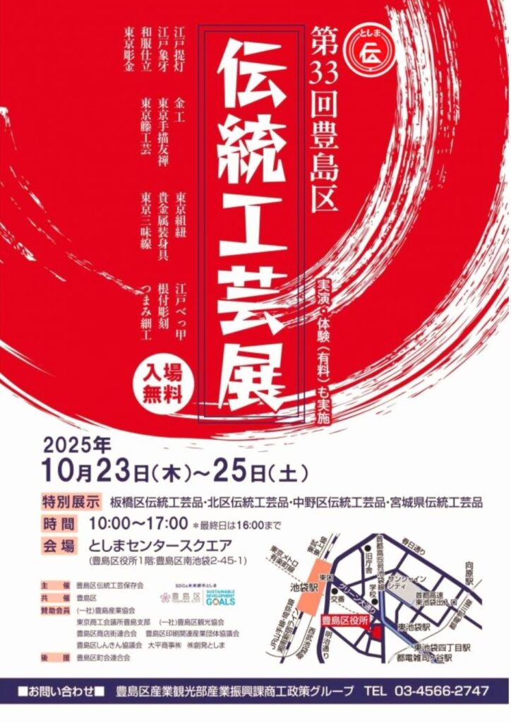 25R7.10.06「豊島区伝統工芸展」10月23日(木)~25日 2025/10/6 2025/10/10 2025/10 【「豊島区伝統工芸展」開催のお知らせ】 第33回豊島区伝統工芸展が、10月23日(木)から25日(土)まで、としまセンタースクエアで開催されます。 豊島区伝統工芸保存会に所属する職人の皆様が一堂に会し、「匠の技」の工芸品の展示・販売や技の実演を行います。 また、宮城県、板橋区、北区、中野区の伝統工芸品の特別展示も予定しています。 是非、お立ち寄り下さい!
