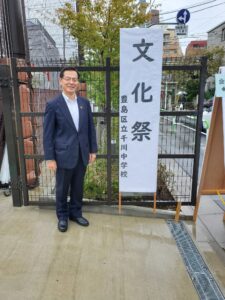 千川中学校の文化祭に同校OBの辻議員が出席。文化祭は合唱コンクールとして「学び舎ぴいす」では、2回目の開催となります。