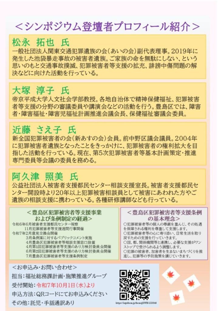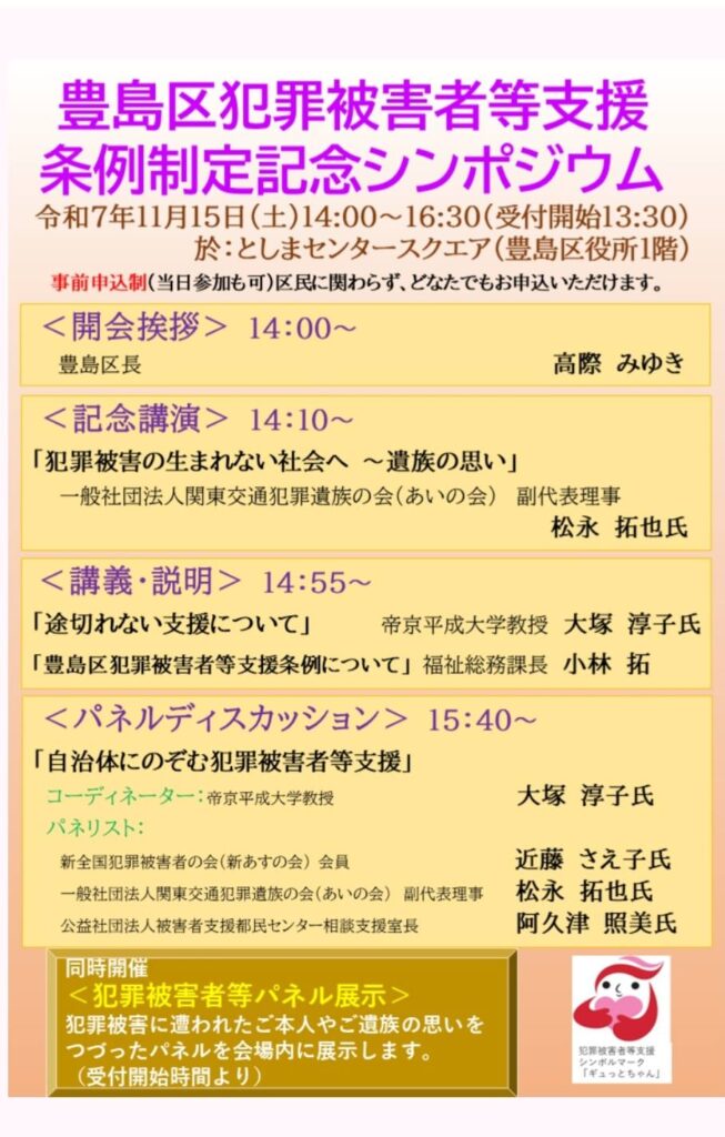 25R7.11.10 「豊島区犯罪被害者等支援条例」記念シンポジウム 2025/11/10 2025/11/11 2025/11 「豊島区犯罪被害者等支援条例」記念シンポジウムのお知らせ 豊島区は、令和7年7月31日に制定された「豊島区犯罪被害者等支援条例」を記念してシンポジウムを開催します。 一般社団法人「関東交通犯罪遺族の会」(通称・あいの会)の副代表理事である松永拓也さんの記念講演をはじめ、パネルディスカッション、パネル展示などを実施します。 日時 11月15日(土)14:00~16:30 場所 としまセンタースクエア(区役所1階) 事前申込が必要です。 https://logoform.jp/f/VCrpp