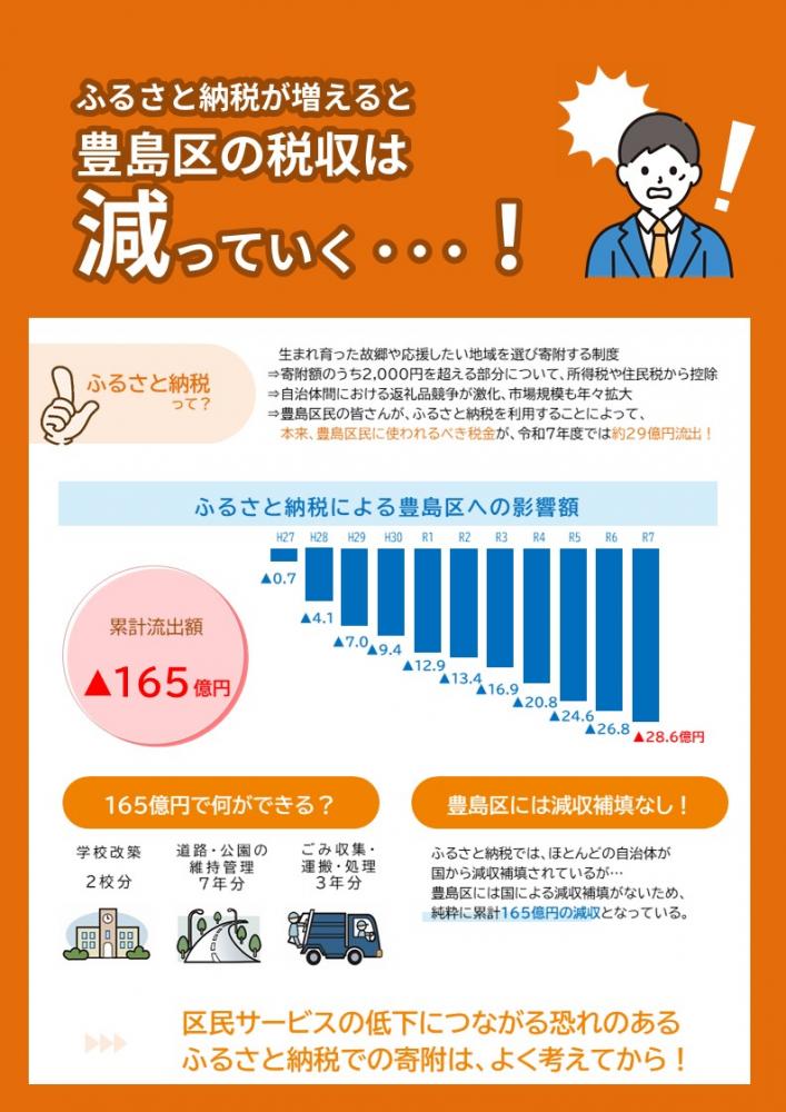 ☆区民の皆様がふるさと納税を利用することで、豊島区の税収は減っており、これまでに累計165億円の減収となっています。