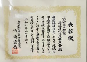 こうした功績が評価され、池袋駅前環境浄化推進委員会(高浜晴彦委員長)は、先月、東京都より表彰されました。