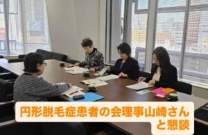 公明区議団は、円形脱毛症患者の会理事山崎さんと懇談し、現状や課題、ご要望をお聞きしました。