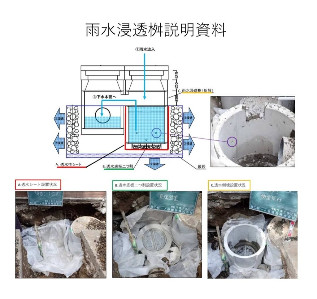 集中豪雨の際、道路に降った雨水の一部を地中に浸透させ、下水への急激な流入を抑えることで、道路冠水の軽減を図ります。