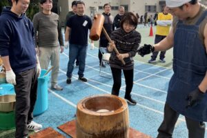 要小学校の校庭において、第17回第9地区もちつき大会が開催され、高際区長も餅つきのお手伝いをしました。